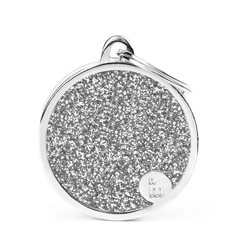 Médaillon grand cercle gris paillettes MyFamily, identification durable & stylée — gravure gratuite incluse.