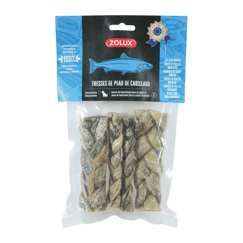 Offrez à votre chien une friandise naturelle, saine et gourmande avec la tresse en peau de morue ZOLUX. Fabriquée à partir de peau de morue séchée, cette friandise conserve 70 à 80 % des nutriments naturels grâce à un procédé de séchage unique. Elle constitue une excellente source de protéines et d’acides aminés facilement digestibles, parfaits pour compléter l’alimentation quotidienne de votre compagnon.